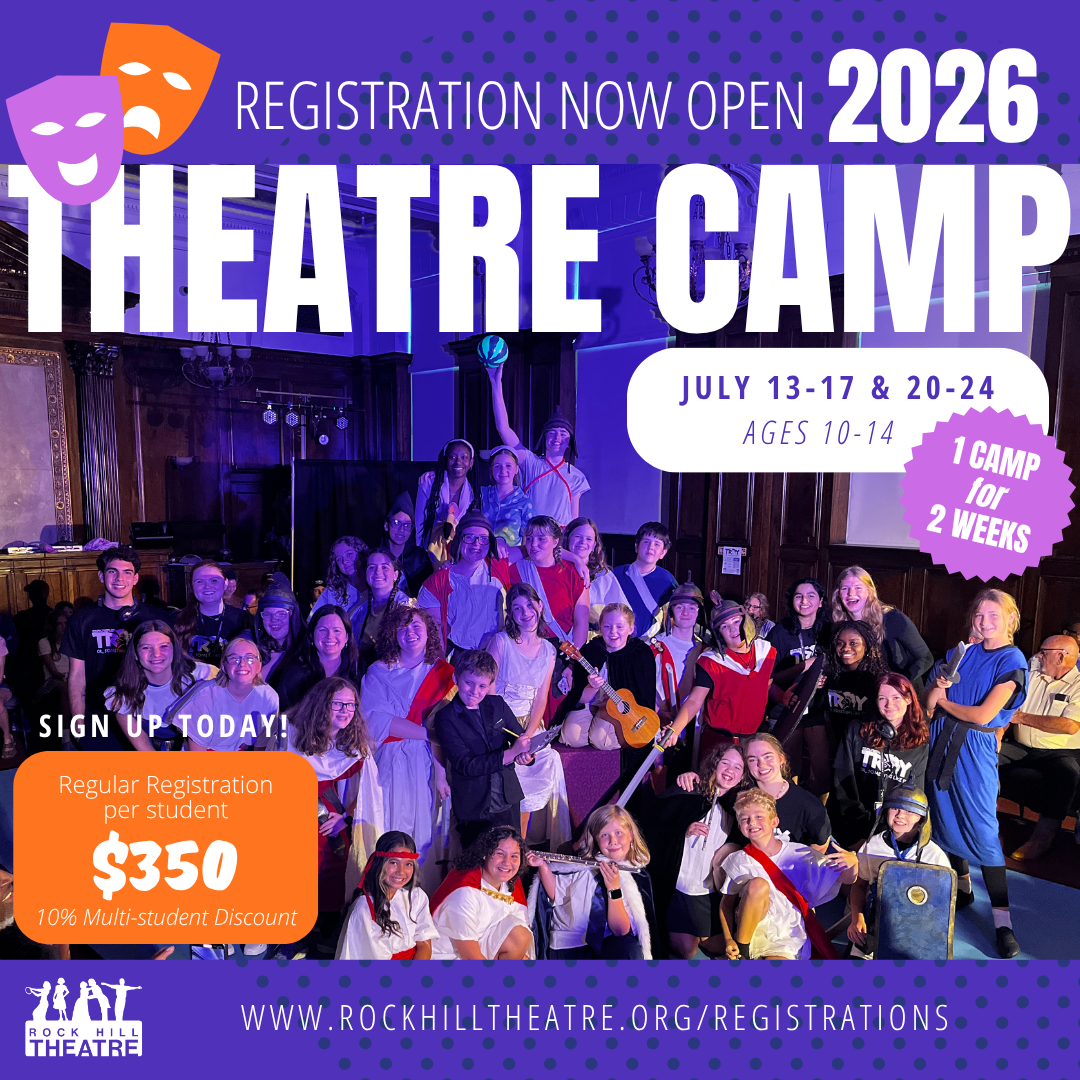 Should you have any more questions, please contact our Camp Coordinator Emily Smith at esmith@rockhilltheatre.org or call us at (803) 326-7428